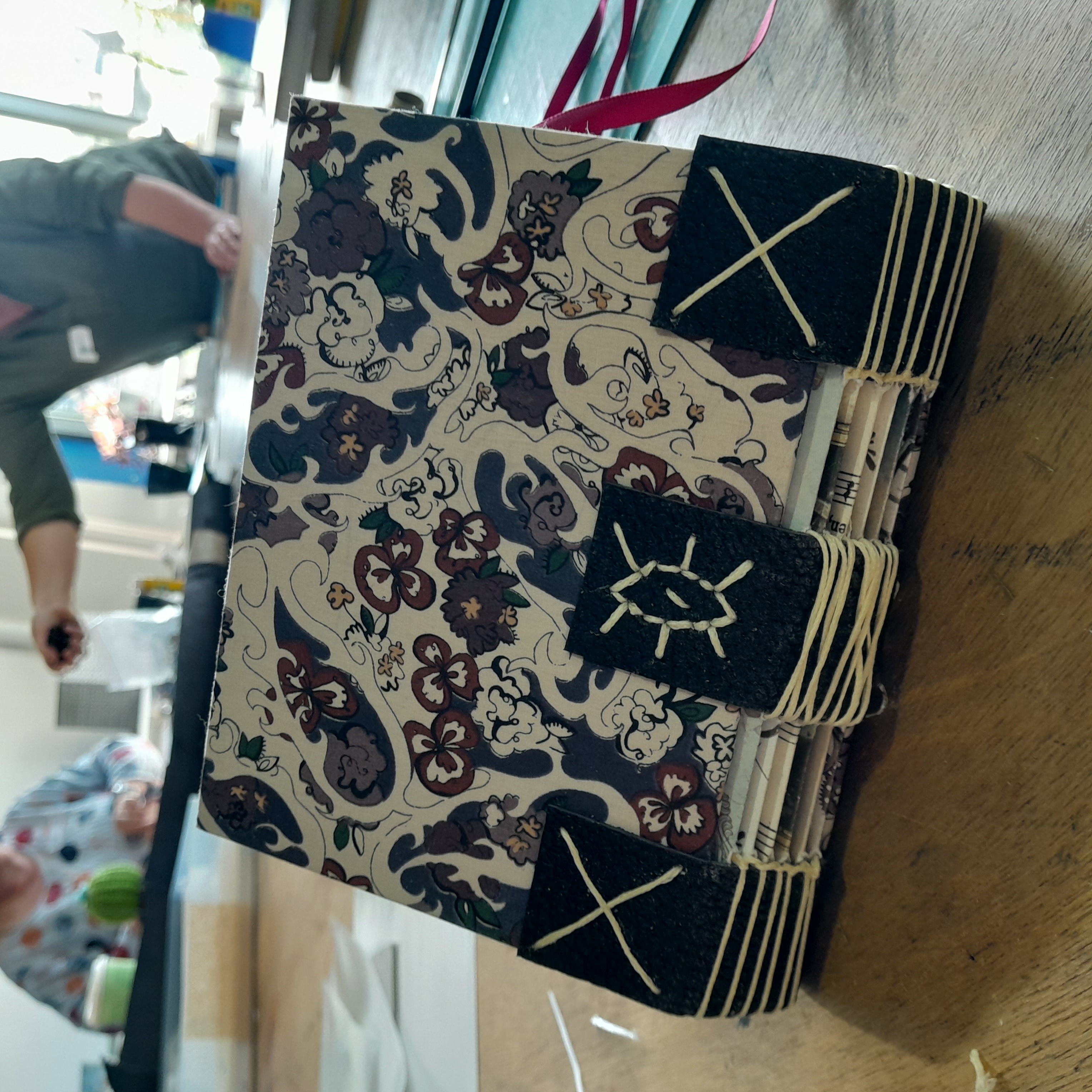 Create an eye-catching hardback book with exposed spine and buttonhole binding, incorporating remnant leather and fabric into the cover, resulting in a chunky book that works well as a personal journal or sketchbook.